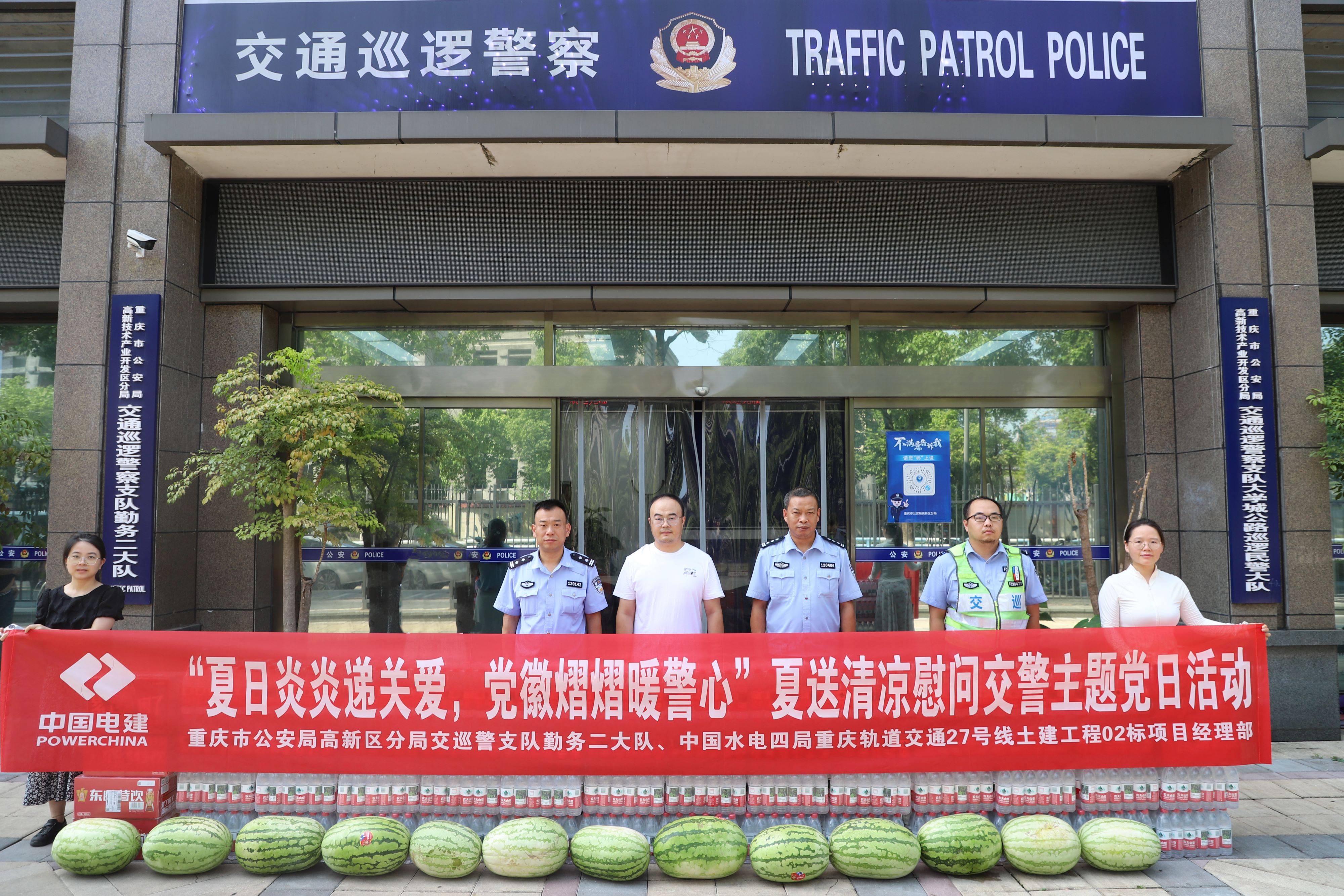 7月17日,重慶地鐵27號(hào)線項(xiàng)目聯(lián)合重慶市公安局高新區(qū)分局交巡警支隊(duì)勤務(wù)二大隊(duì)開展“夏日炎炎遞關(guān)愛,黨徽熠熠暖警心”夏送清涼慰問交警主題黨日活動(dòng)。 7月末的重慶已值盛夏,高新區(qū)分局交巡警支隊(duì)勤務(wù)二大隊(duì)一線交警頂著烈日維護(hù)交通秩序,守護(hù)一方安寧,深受市民尊敬和愛戴。項(xiàng)目部為他們送去了礦泉水、西瓜等清涼物資,并對(duì)執(zhí)勤人員辛勤維護(hù)轄區(qū)道路安全暢通表示了由衷的感謝和敬意。 高新區(qū)分局交巡警支隊(duì)勤務(wù)二大隊(duì)負(fù)責(zé)人對(duì)項(xiàng)目部的慰問表示感謝“感謝水電四局對(duì)我們工作的大力支持,我們會(huì)繼續(xù)為廣大人民群眾創(chuàng)造安全、暢通、有序的施工交通環(huán)境,以實(shí)際行動(dòng)回饋群眾的關(guān)愛。立足本職、堅(jiān)守崗位,為人民群眾的生命財(cái)產(chǎn)安全保駕護(hù)航,為地方經(jīng)濟(jì)快速發(fā)展和群眾出行安全做出更大的貢獻(xiàn)。” 本次送清涼慰問活動(dòng)體現(xiàn)了企業(yè)與交通管理機(jī)構(gòu)彼此的理解與支持,為地企聯(lián)動(dòng)打下基礎(chǔ),彰顯了警民情深,為生產(chǎn)安全、道路交通安全奠定了基礎(chǔ)。重慶地鐵27號(hào)線項(xiàng)目部全體將以實(shí)干為筆,全力以赴,共建文明、安全、和諧的社會(huì)環(huán)境,維護(hù)轄區(qū)治安穩(wěn)定。